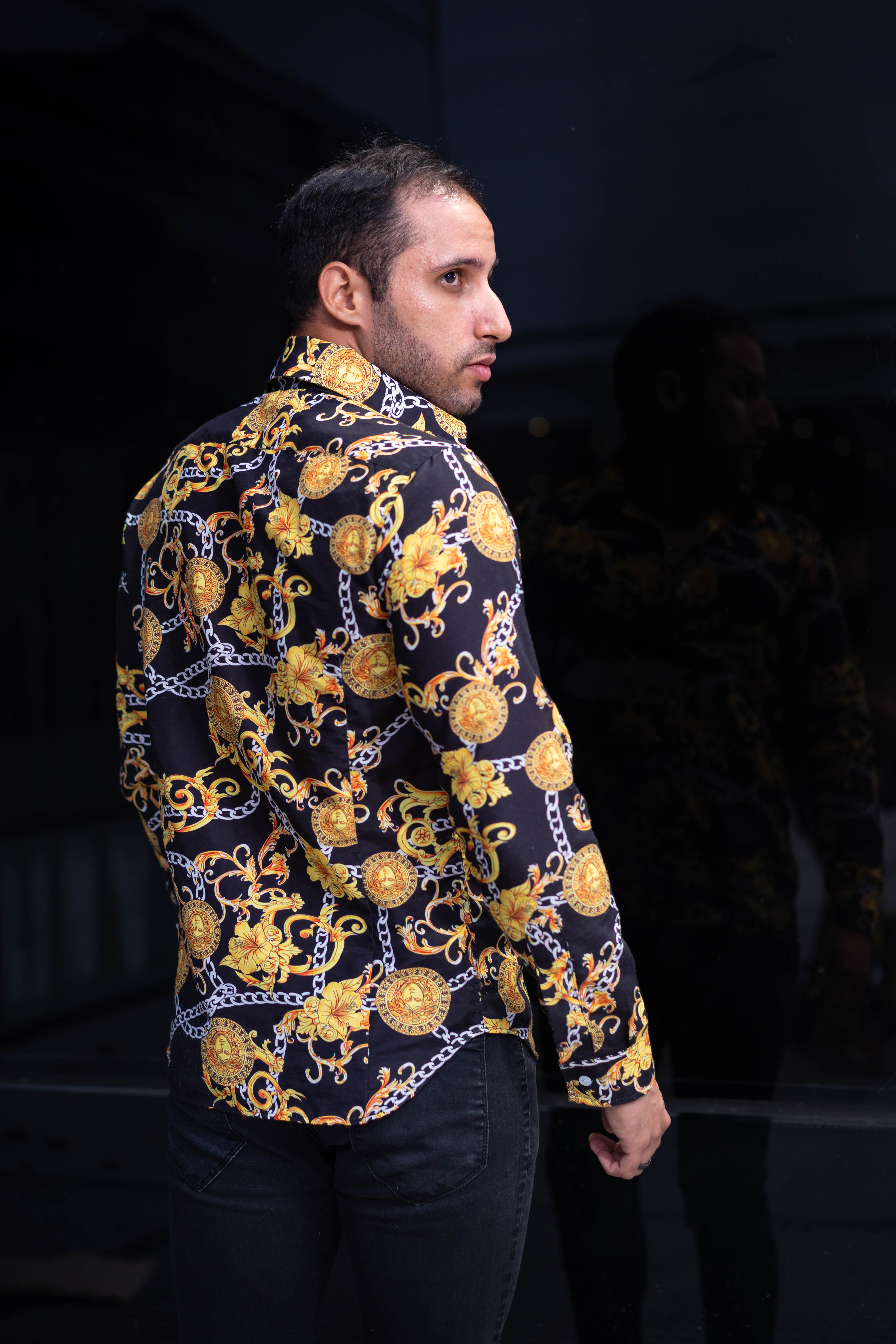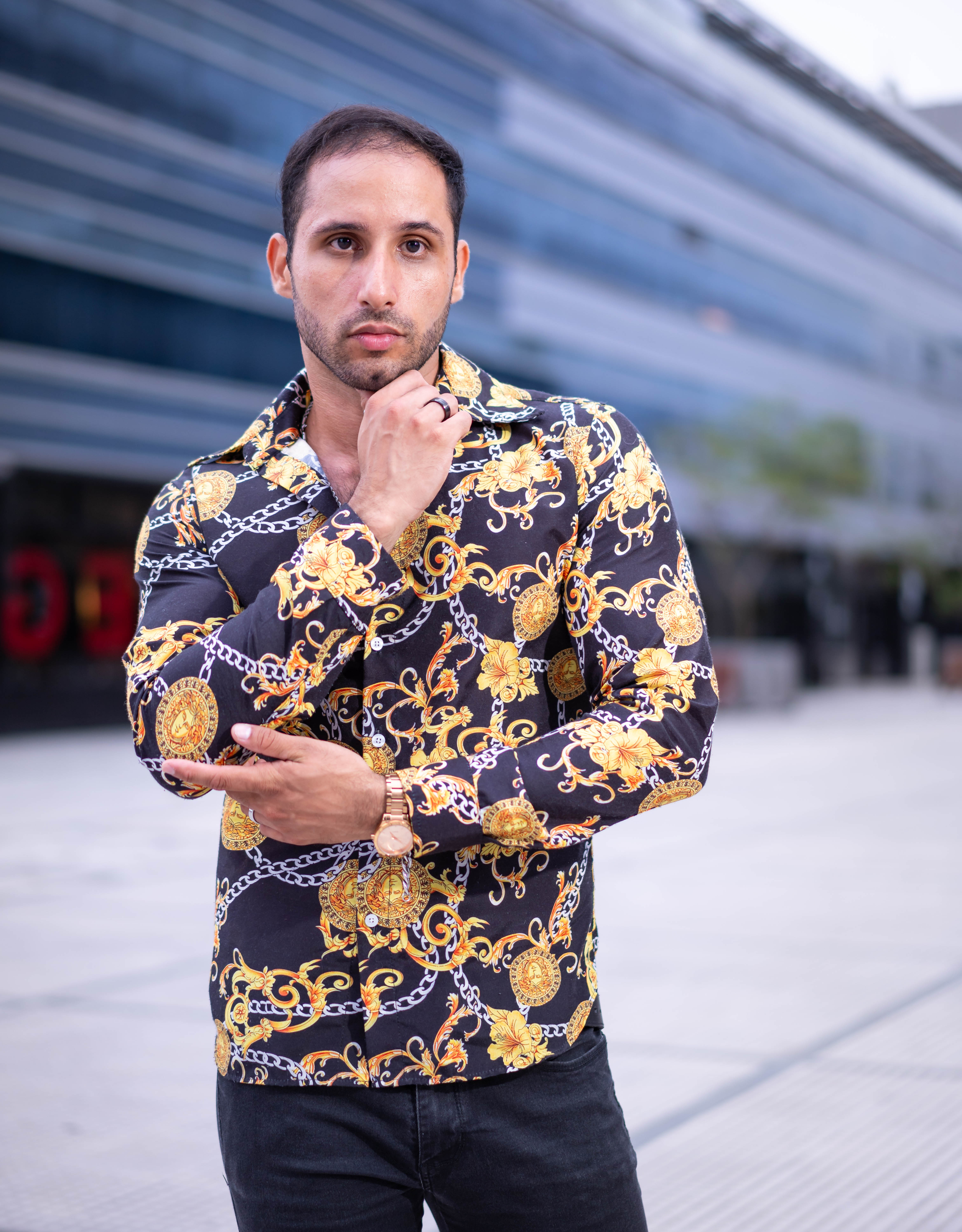 Camisa manga larga sport calce Slimfit, confeccionada en poplin italiano de excelente calidad.Esta camisa abotonada de manga larga presenta el característico estampado Barroco, un código de la casa muy apreciado.